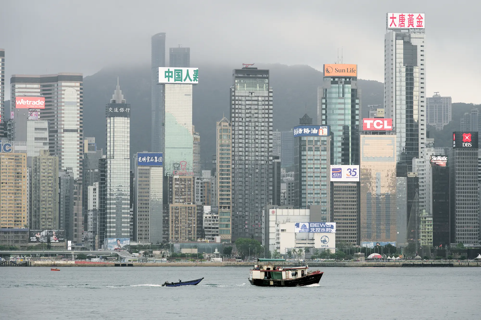 Signs and towers line the waterfront while a low boat moves quietly across the frame.