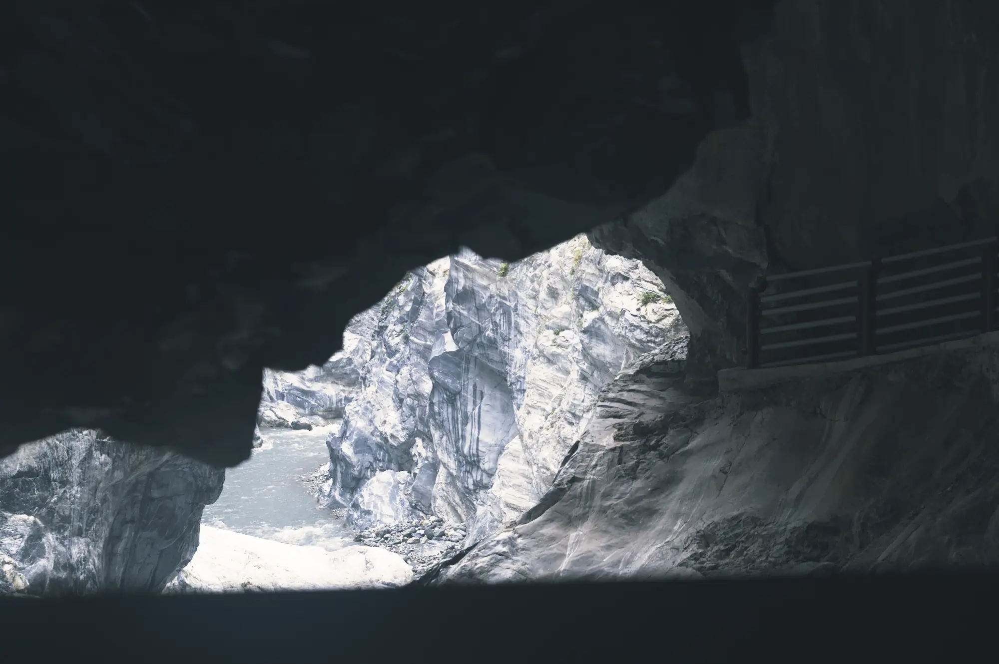 The interior darkens toward a bright opening, where stone and light meet abruptly.