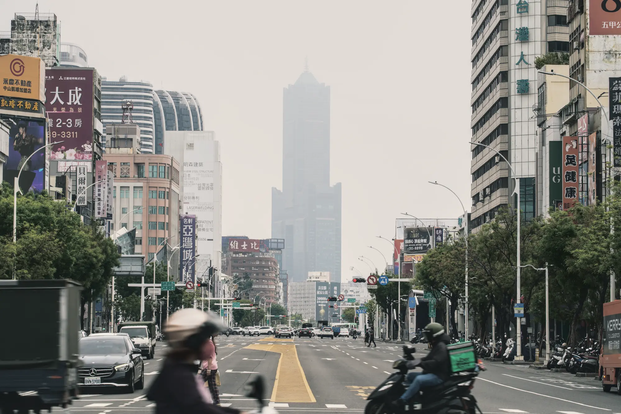 The boulevard runs directly toward a distant tower, balancing movement with alignment.