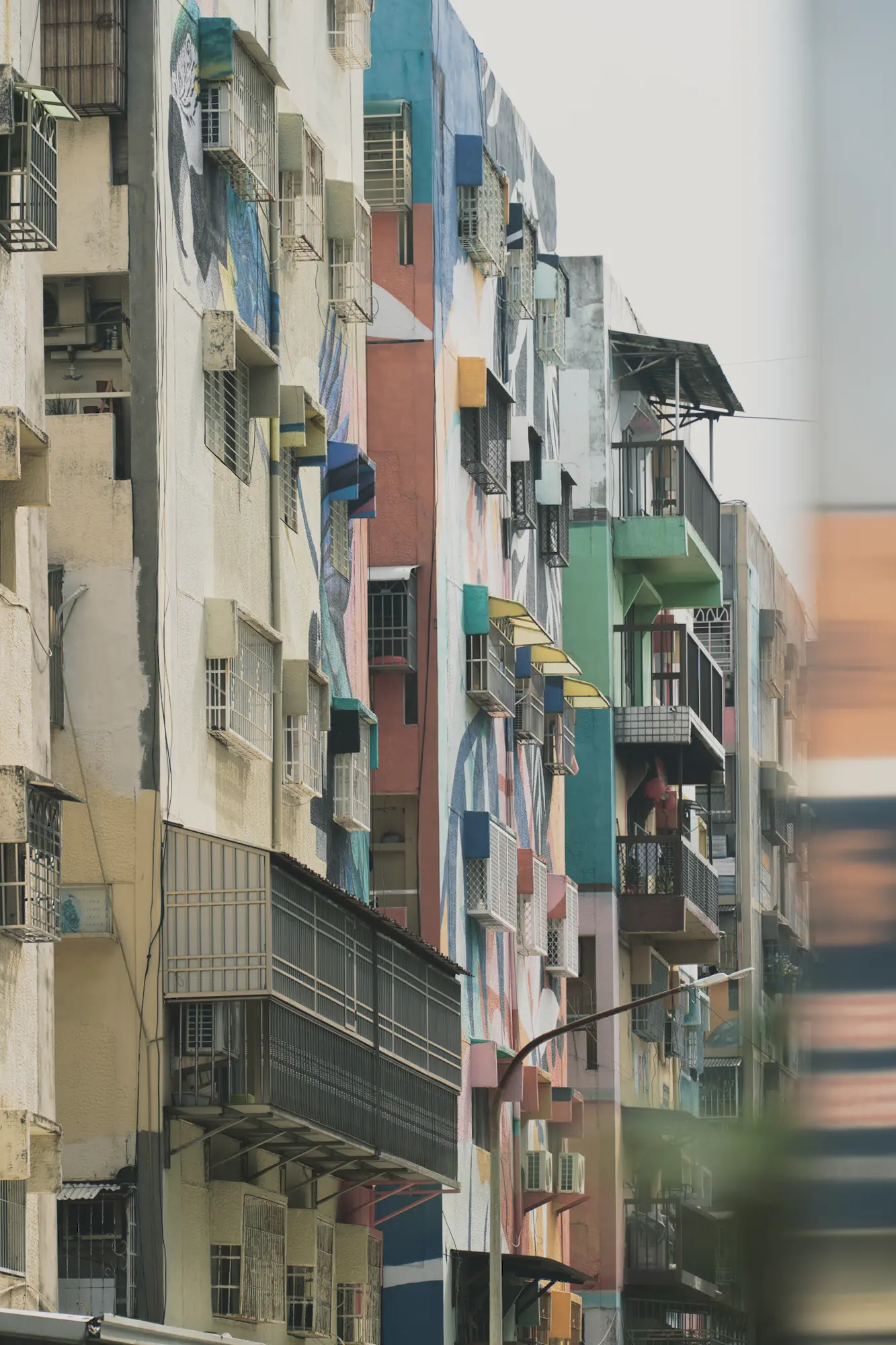 A stack of painted façades compresses into a vertical field of color and utility.