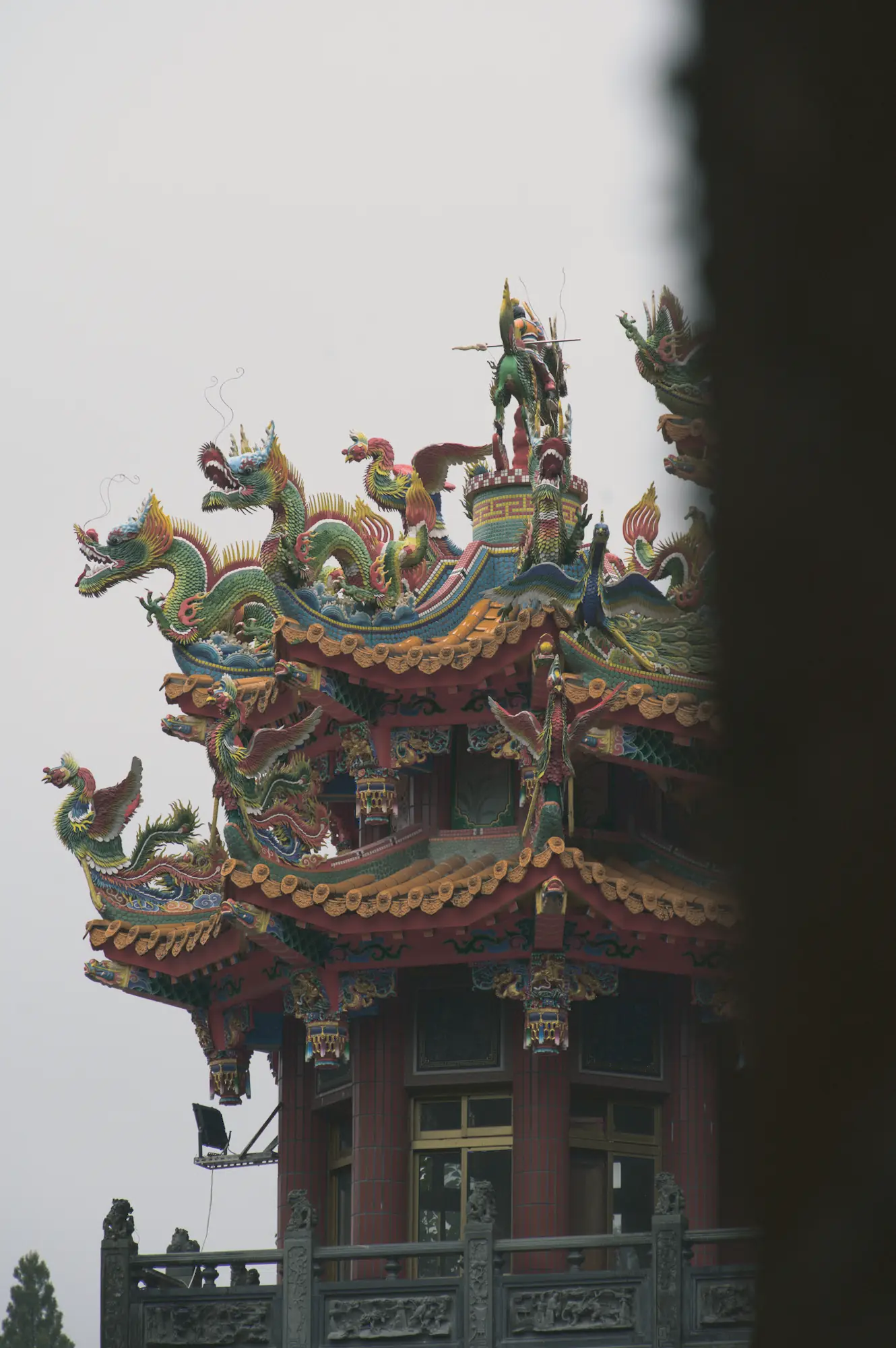 A temple roof emerges through a narrow foreground opening, ornate but partially withheld.