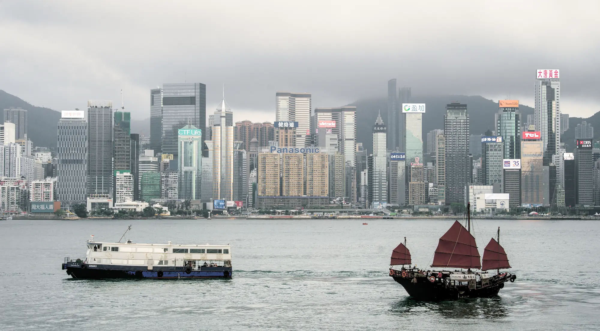 Two boats cross in front of the skyline, separating water, city, and cloud into calm bands.