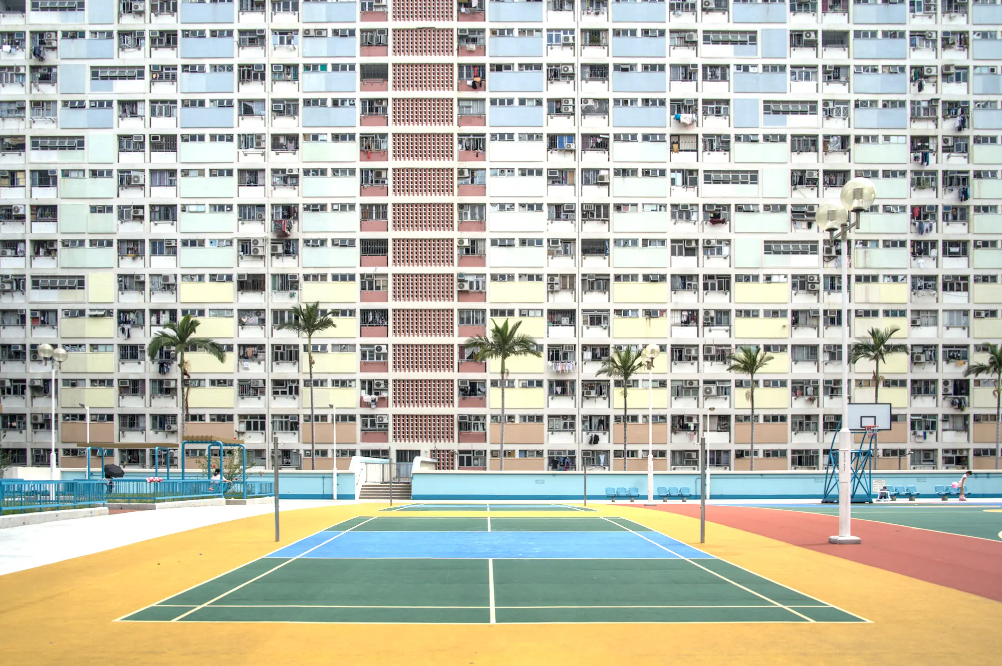 The court and housing block meet as parallel bands of color, repetition, and scale.
