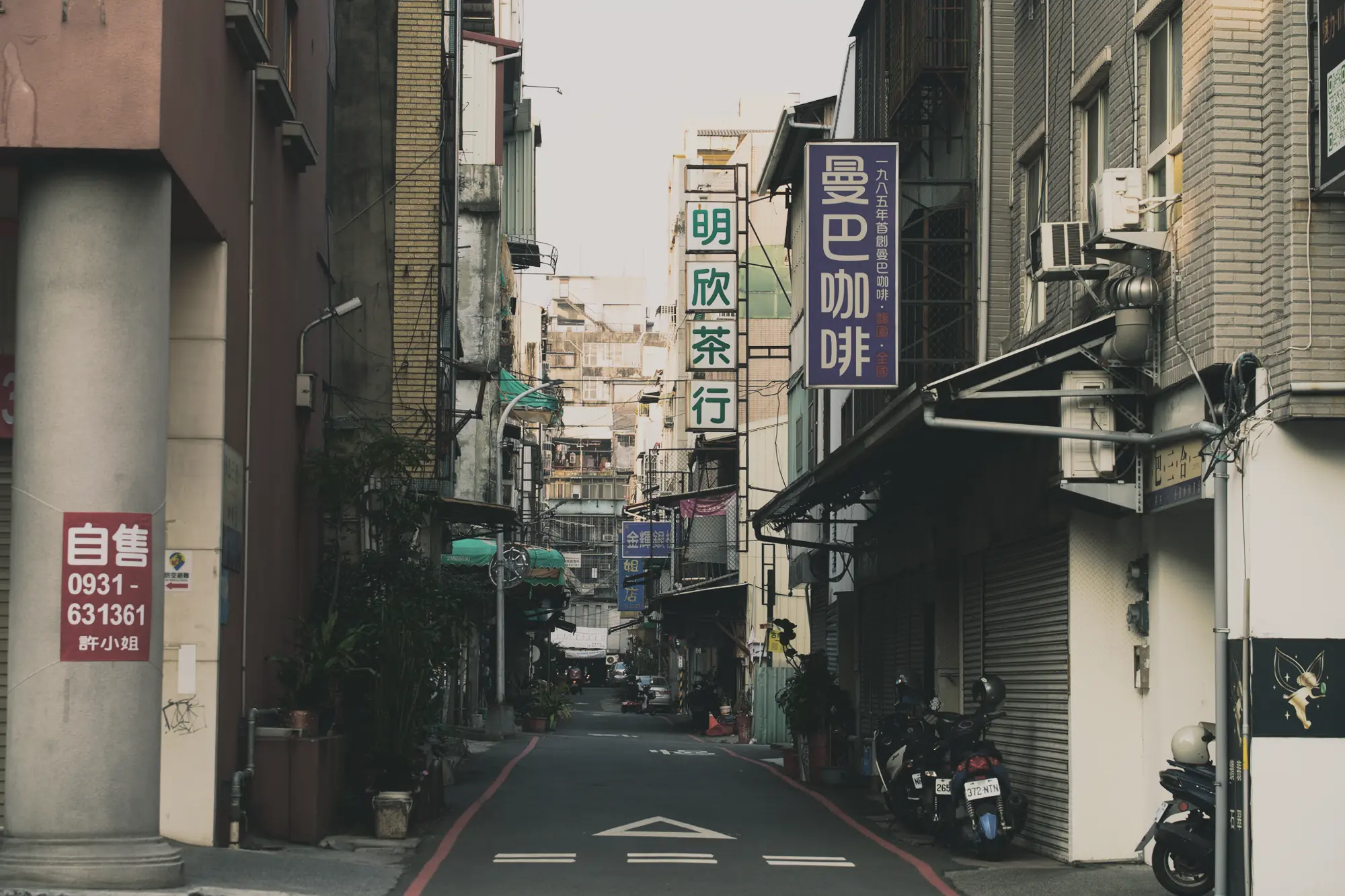 The street narrows between signs, balconies, and parked scooters, dense but still.