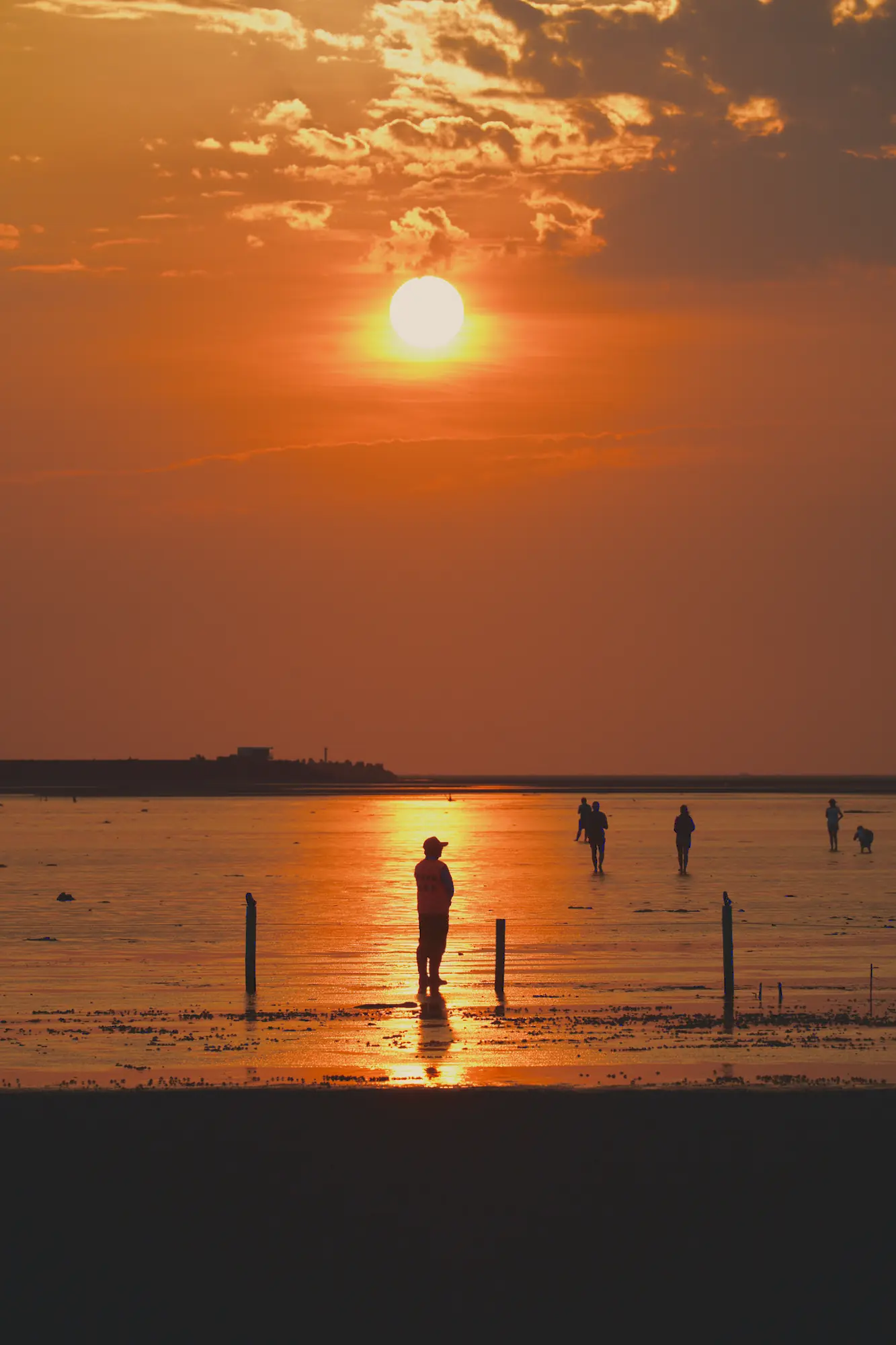The sun drops over shallow water, leaving a narrow vertical path of reflection.