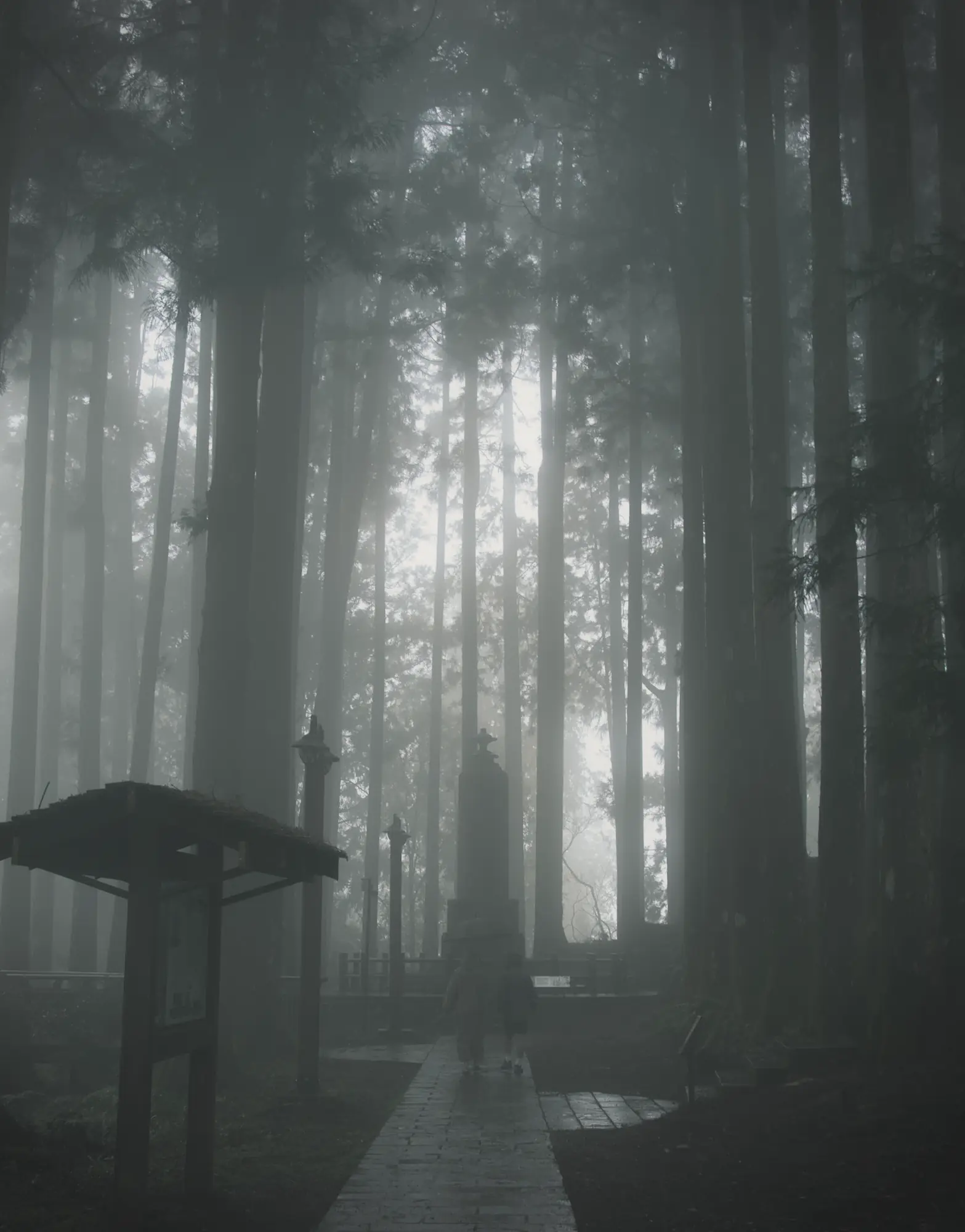 A boardwalk recedes into fog and tall trees, leaving the forest to carry the scene.