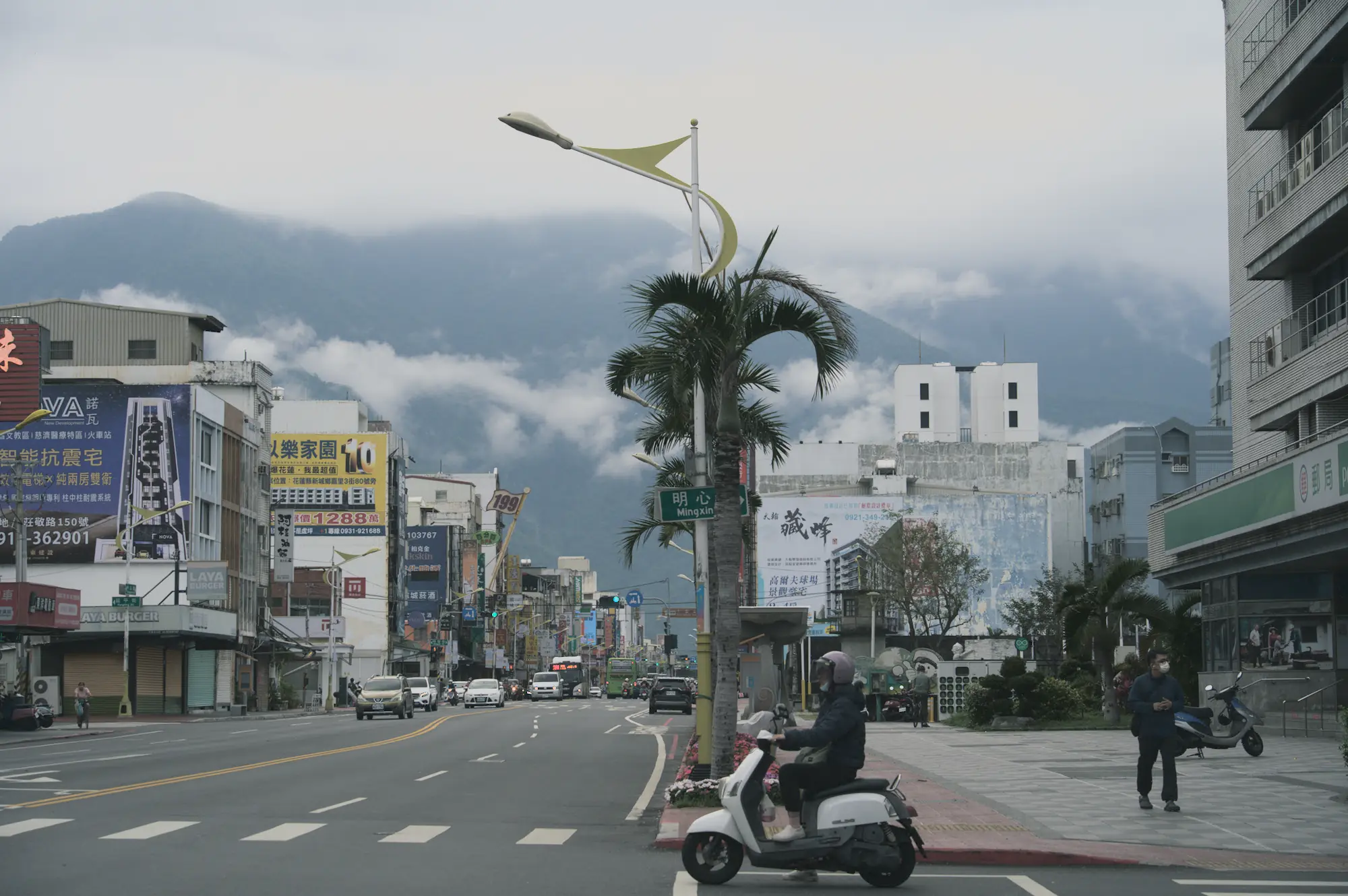 A wide street opens toward low cloud and mountain edges beyond the town.