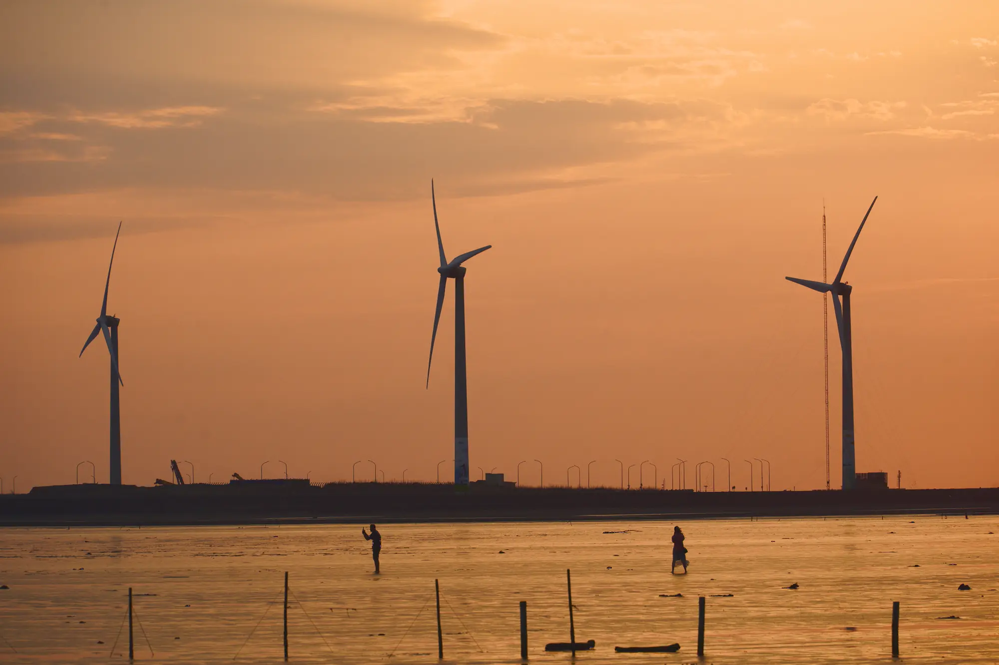 Sunset light washes the flats while two turbines hold the frame in balance.
