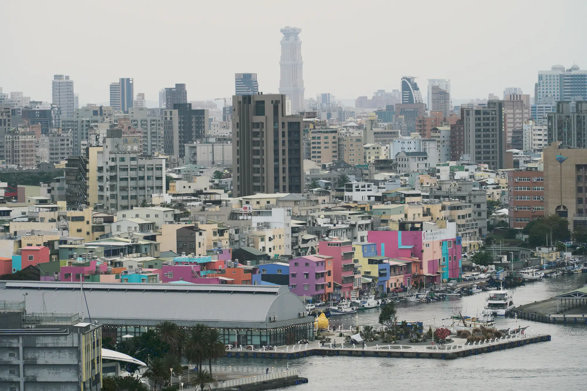 Blocks of turquoise, pink, and yellow gather at the edge of a gray city.