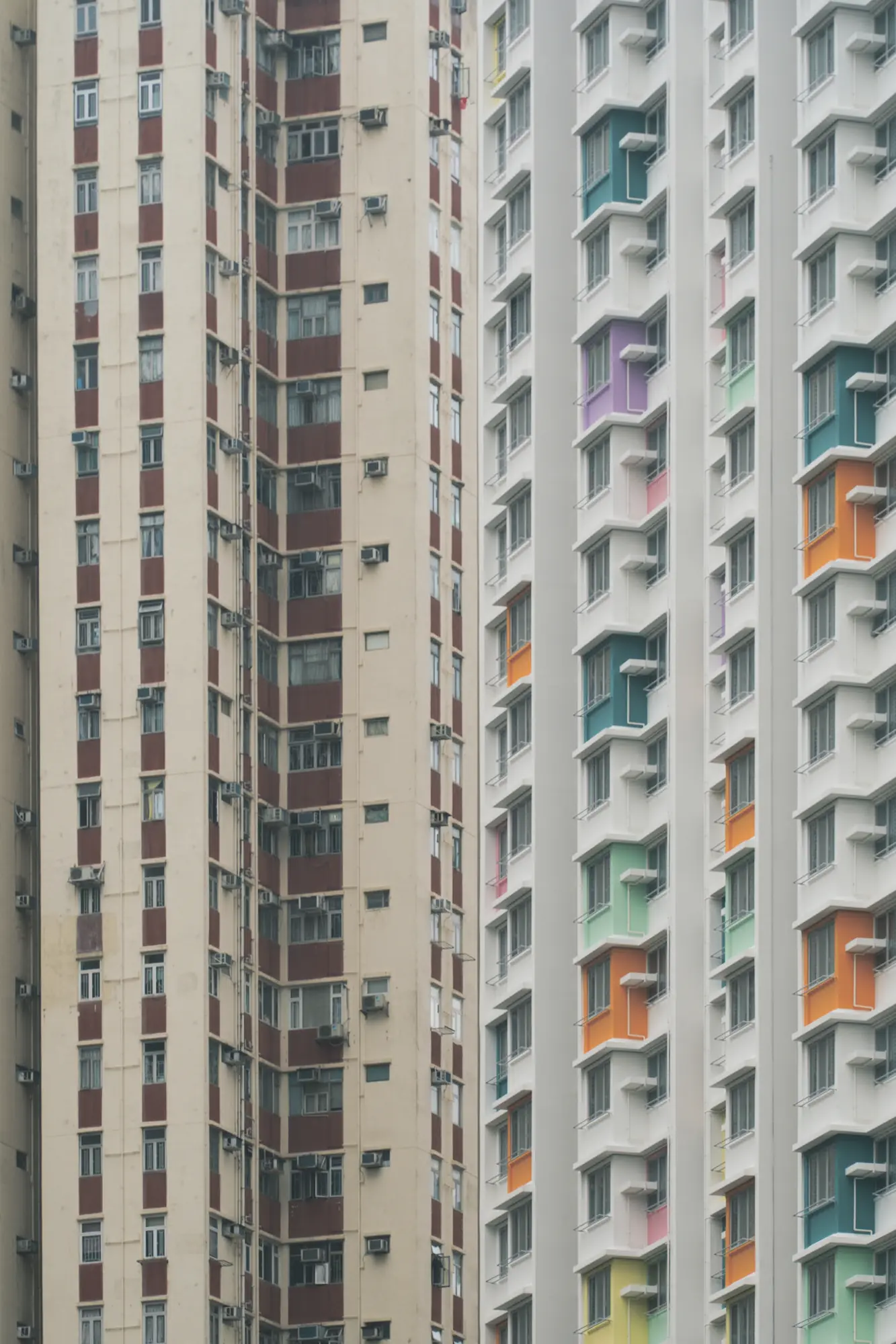 Tall residential façades stack upward in a compressed palette of pale color.