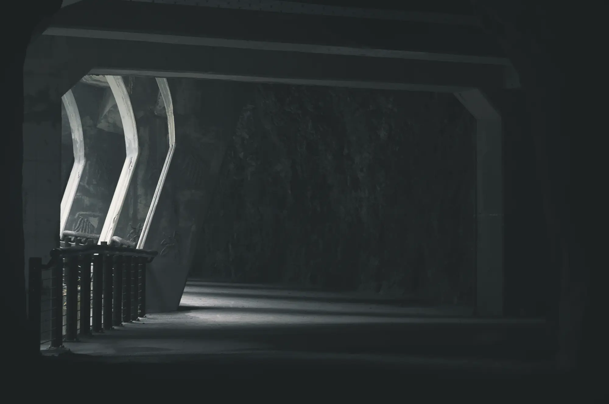 The tunnel advances through a series of hard-edged openings, each holding a small measure of light.