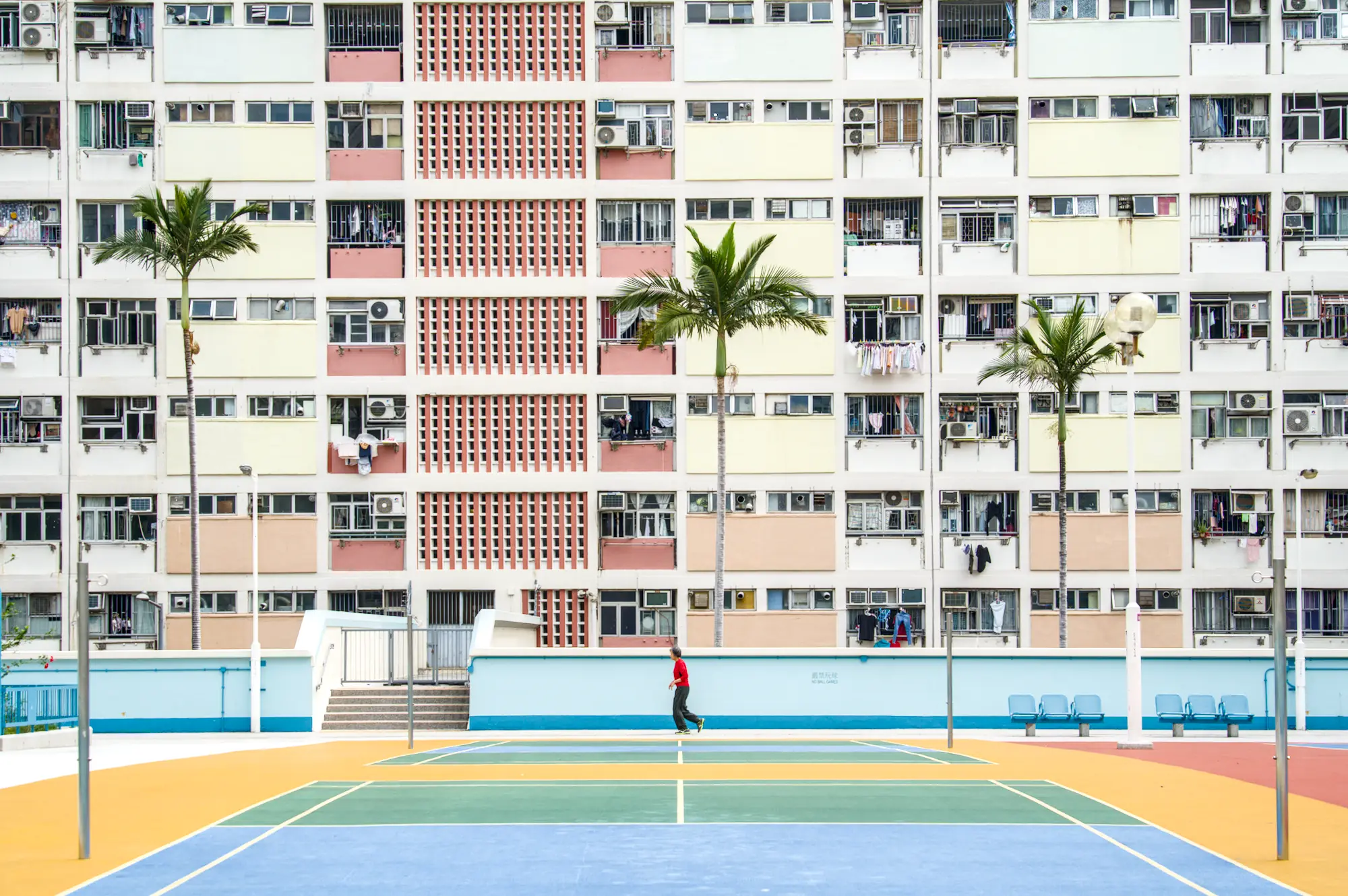 A lone figure crosses the court beneath a large gridded façade, briefly humanizing its scale.