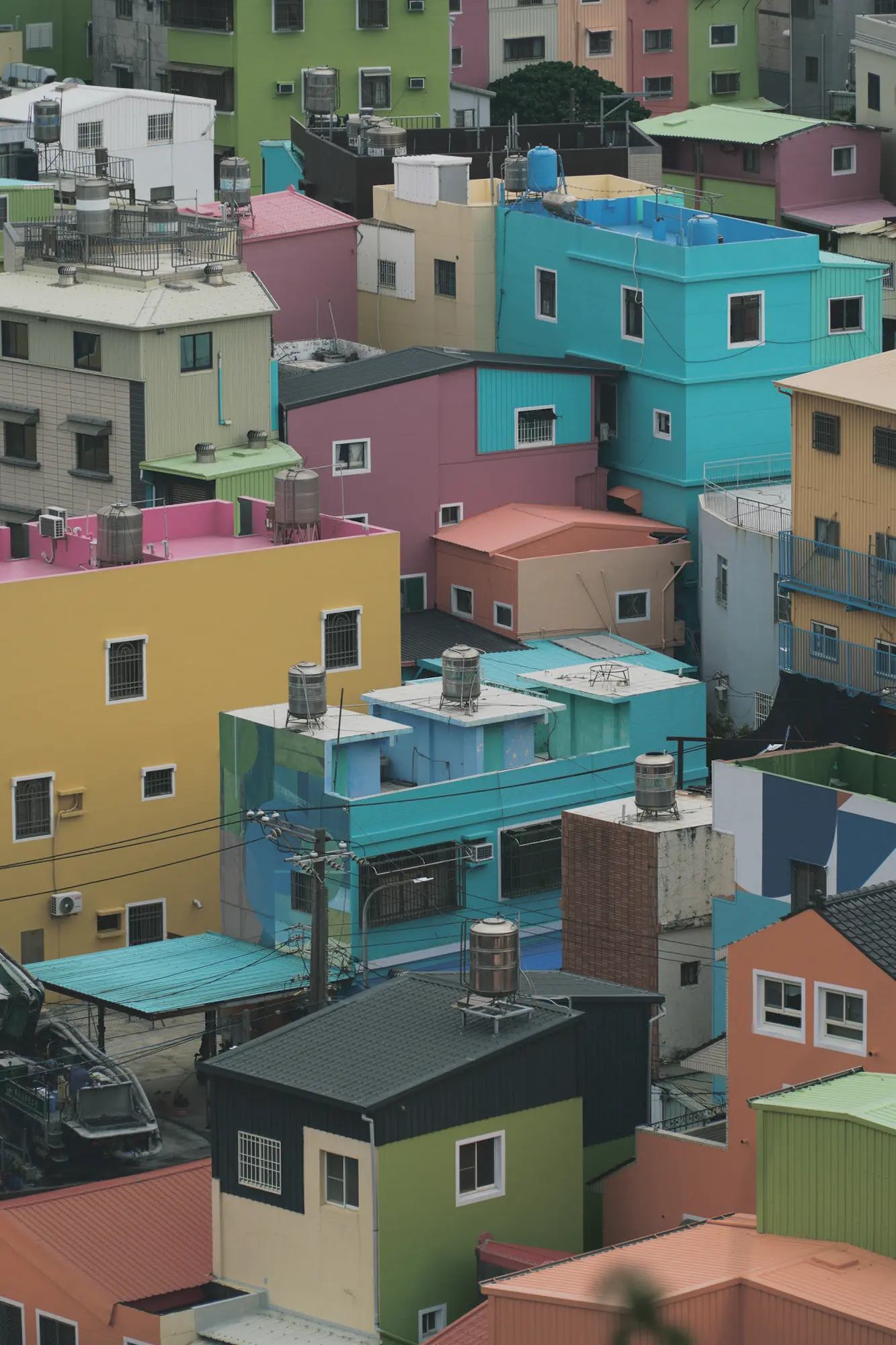The hillside resolves into a tight composition of painted houses and repeated windows.