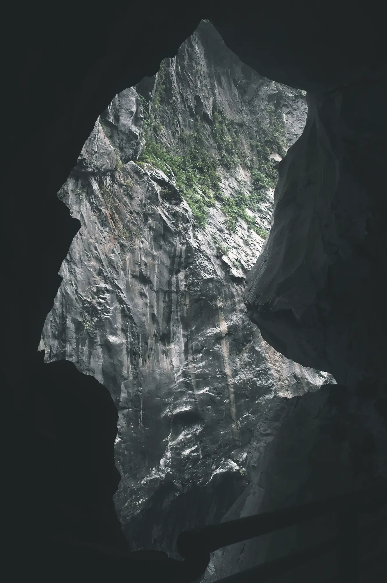 The rock face breaks into an irregular opening, exposing a narrow strip of the gorge beyond.