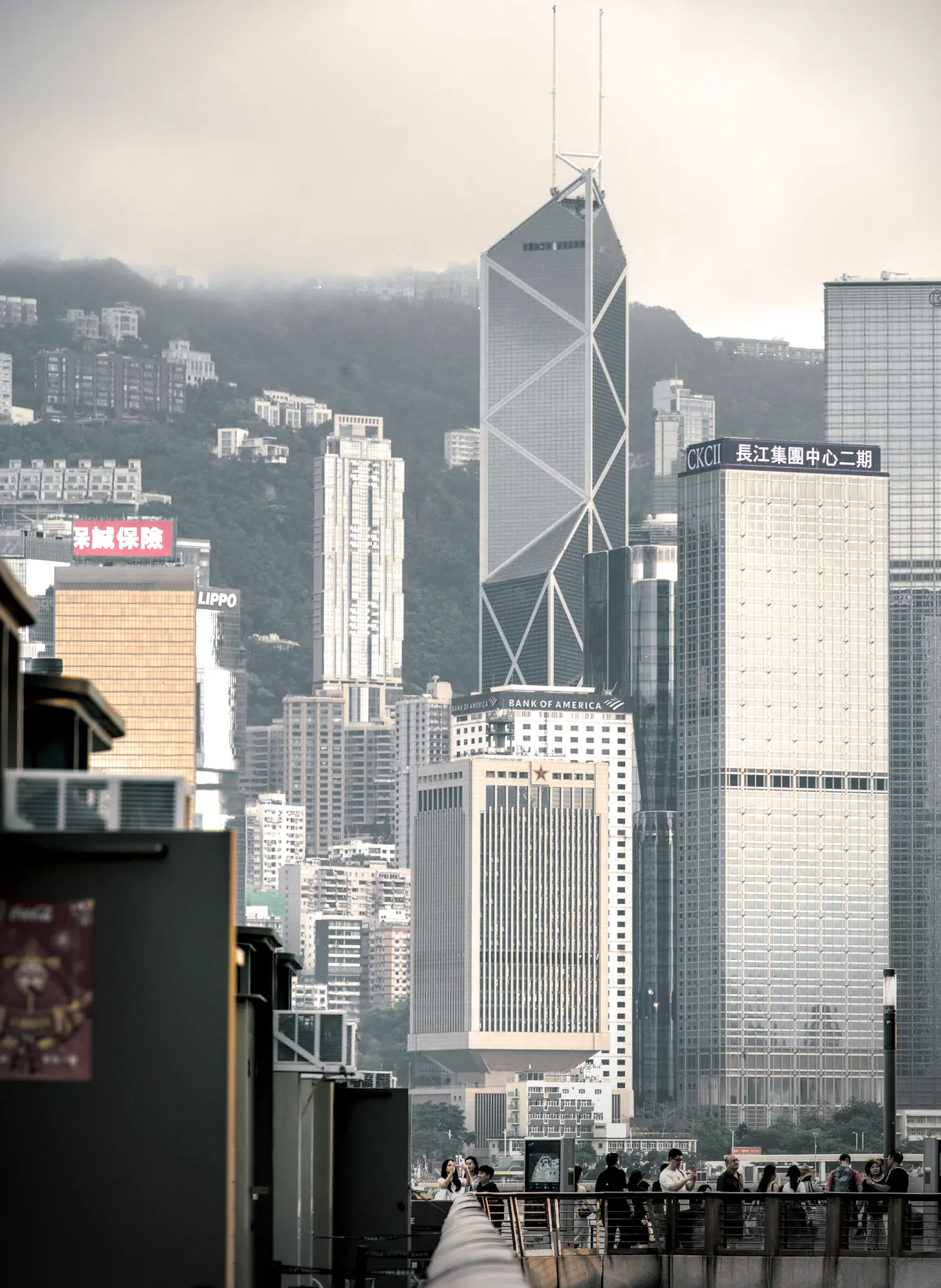 The skyline is caught between near buildings, with the Bank of China Tower rising within the gap.