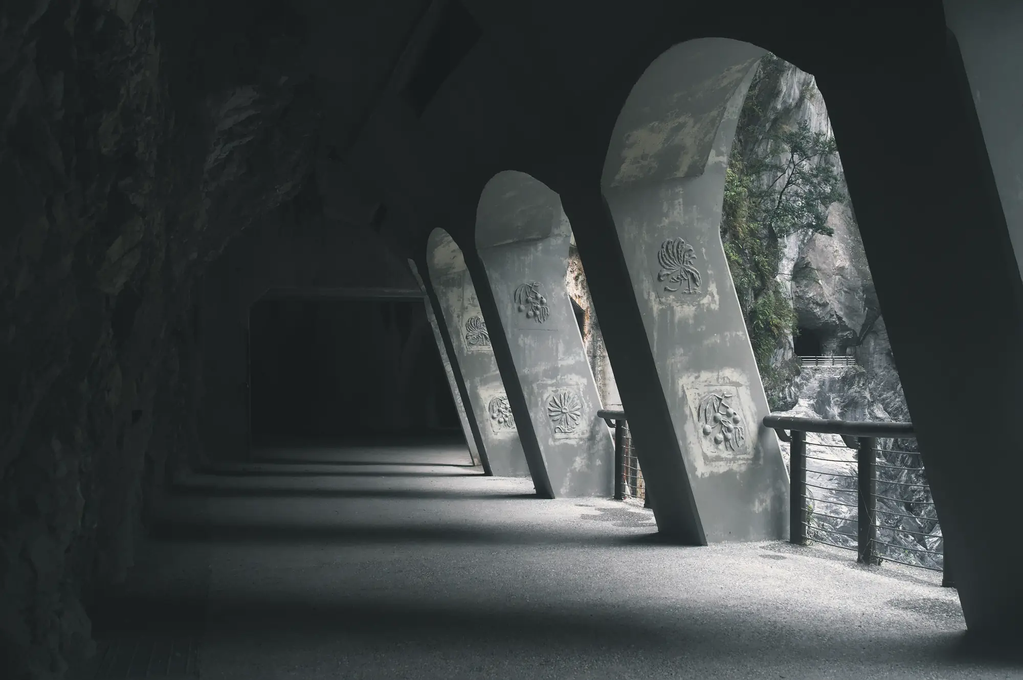 Repeating openings and angled supports pull the walkway into shadow and sequence.