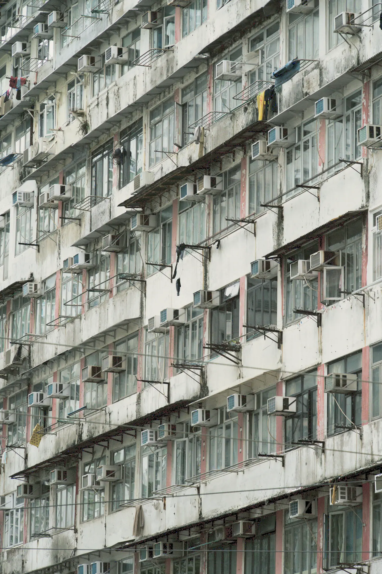 Air conditioners, rails, and stained concrete compress into a worn residential pattern.