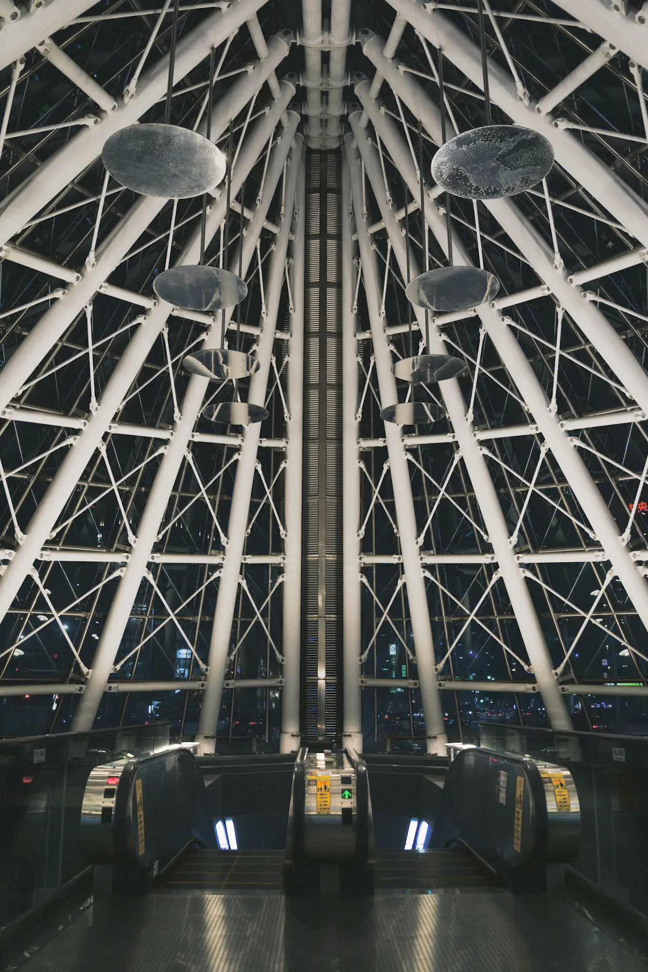 Steel spokes and suspended cabins turn the structure into a radial study.